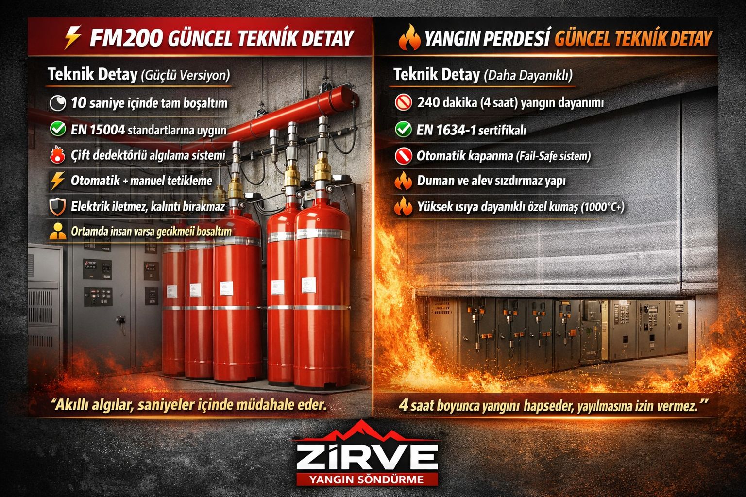 Zirve Yangin Söndürme olarak; yangin güvenliginde en ileri teknolojileri kullanarak can ve mal güvenligini koruyoruz. Yangin perdelerinden gazli söndürme sistemlerine, sprinkler çözümlerinden projelendirmeye kadar anahtar teslim hizmet sunuyoruz.
